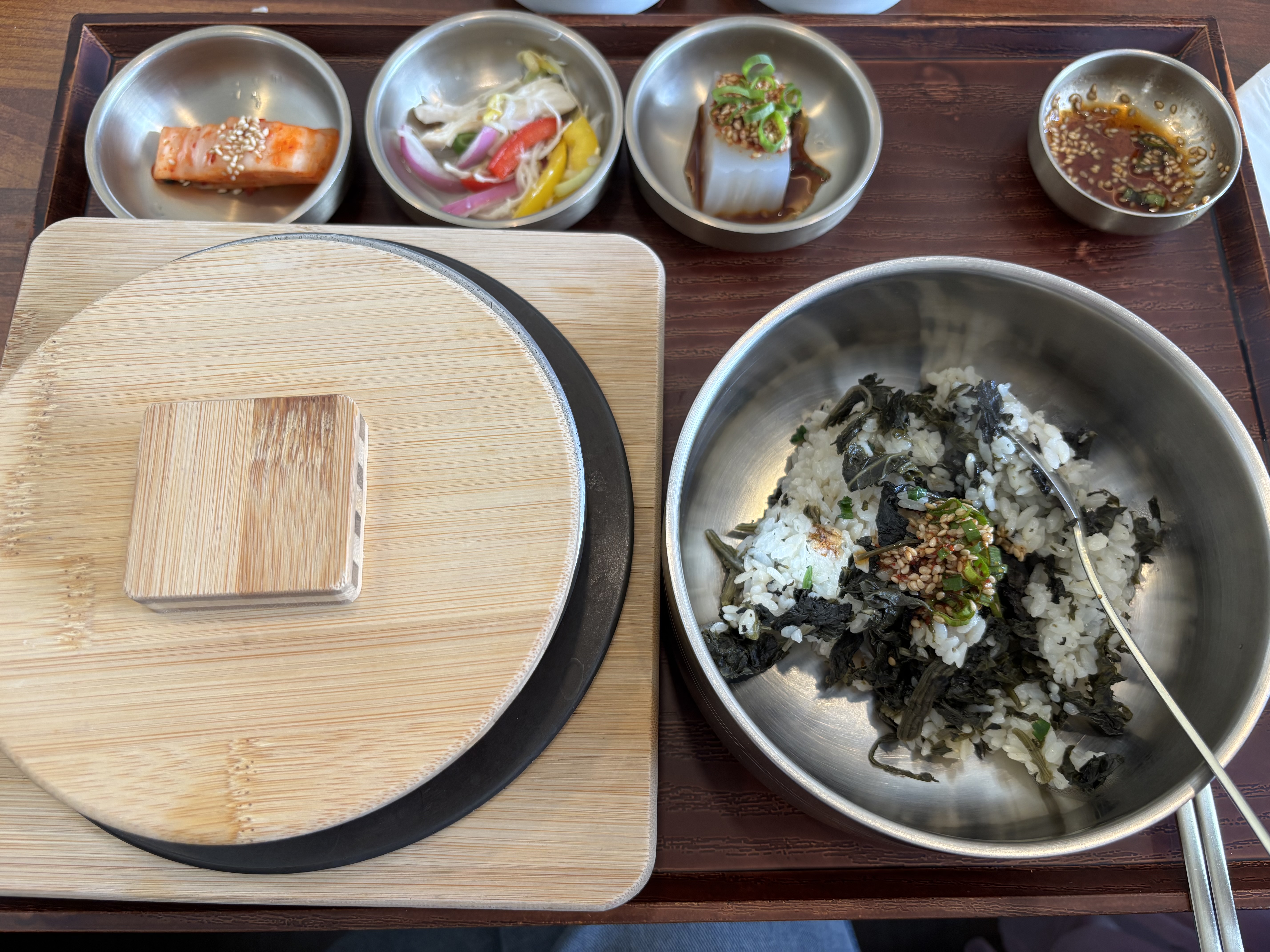 Another day we all went to the library and walked over to Sangsang, a Korean restaurant just nearby, for a warm bowl of sotbap. Rice in a stone pot, scorched crust at the bottom, grilled fish with crisp skin, tender tteok-galbi in its sweet glaze. Familiar tastes, filling us up properly. One day after another, the time kept going — steady, unremarkable, whole.