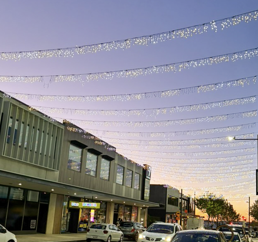 Westgate's row of permanent outlet stores were running another 30 to 40 per cent — sometimes 50 — off the already-marked-down tags. Running shoes for $30 a pair. We picked up a pair or two for everyone, hoodies for the girls, shorts for PeNnY. By the time we'd finished, the children were declaring starvation, so we ducked into an Italian place nearby for dinner. On the way back to the car, fairy lights had been strung between the buildings, glowing like small stars over Westgate at dusk.