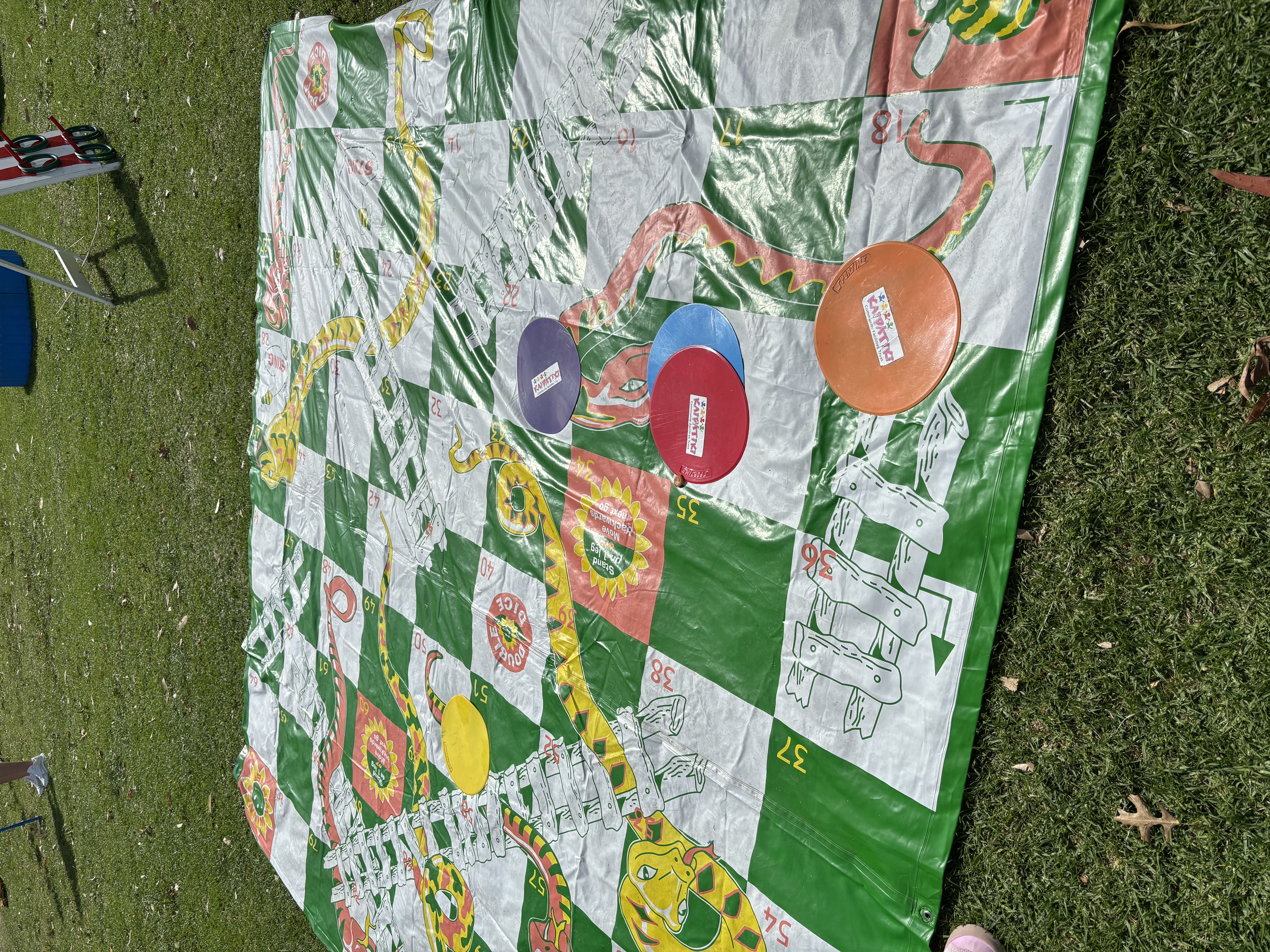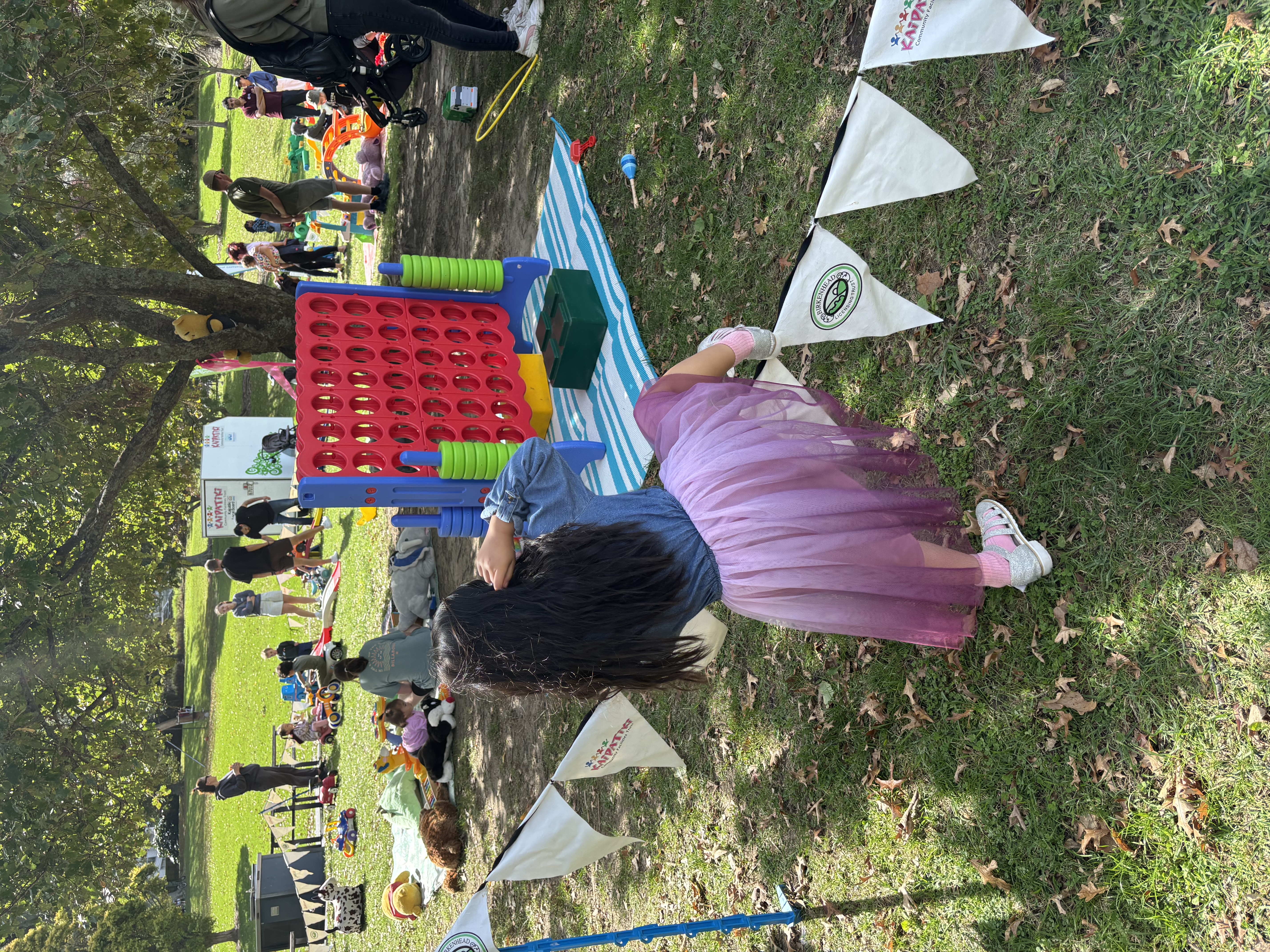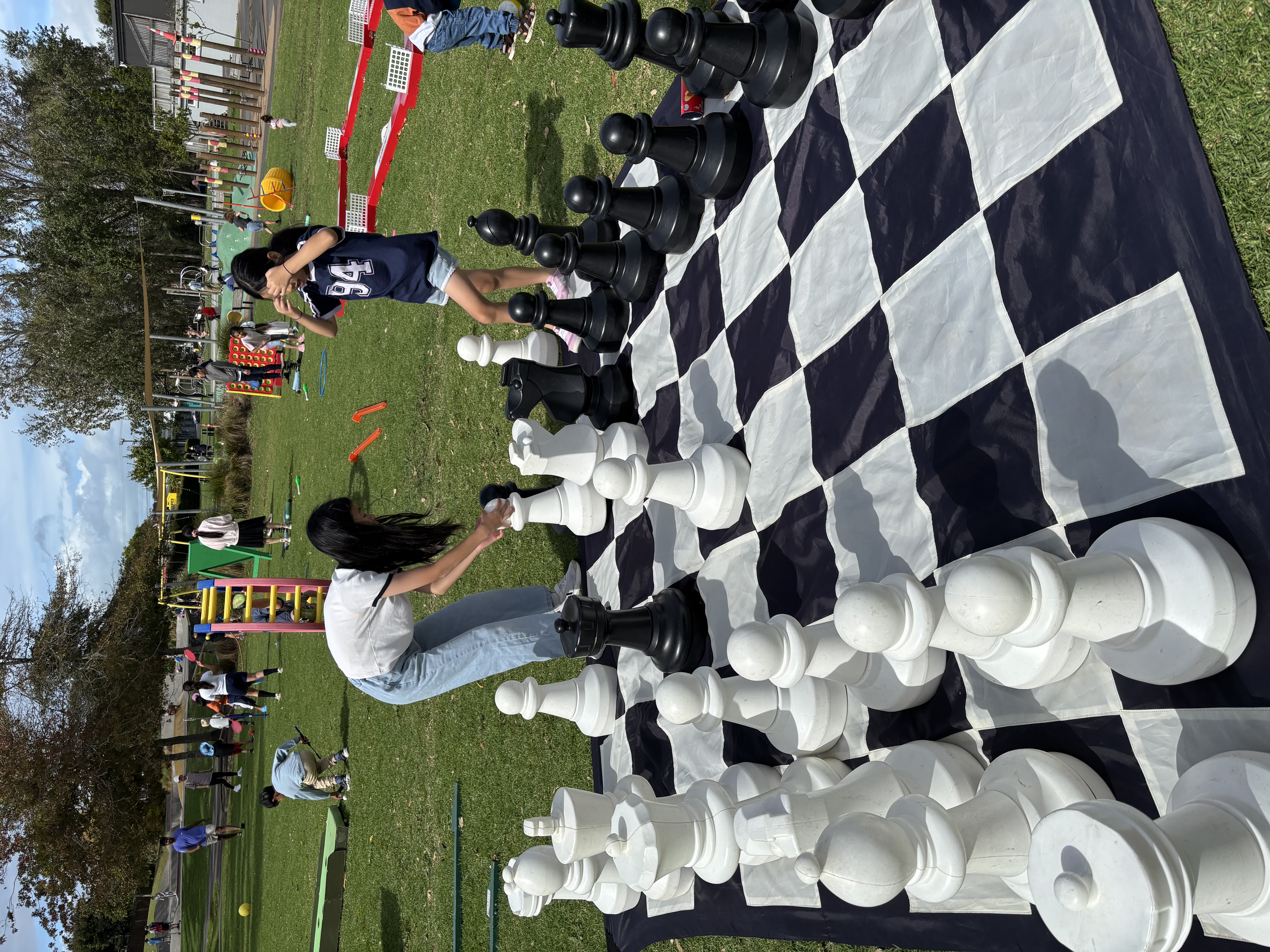 Children from toddlers to ten-year-olds careened across the grass. Somebody's toddler was being lifted onto a stilt by an older kid he'd never met. A dad was attempting the giant chess and losing. A group of girls were mid-argument about the rules of Snakes and Ladders at human scale.