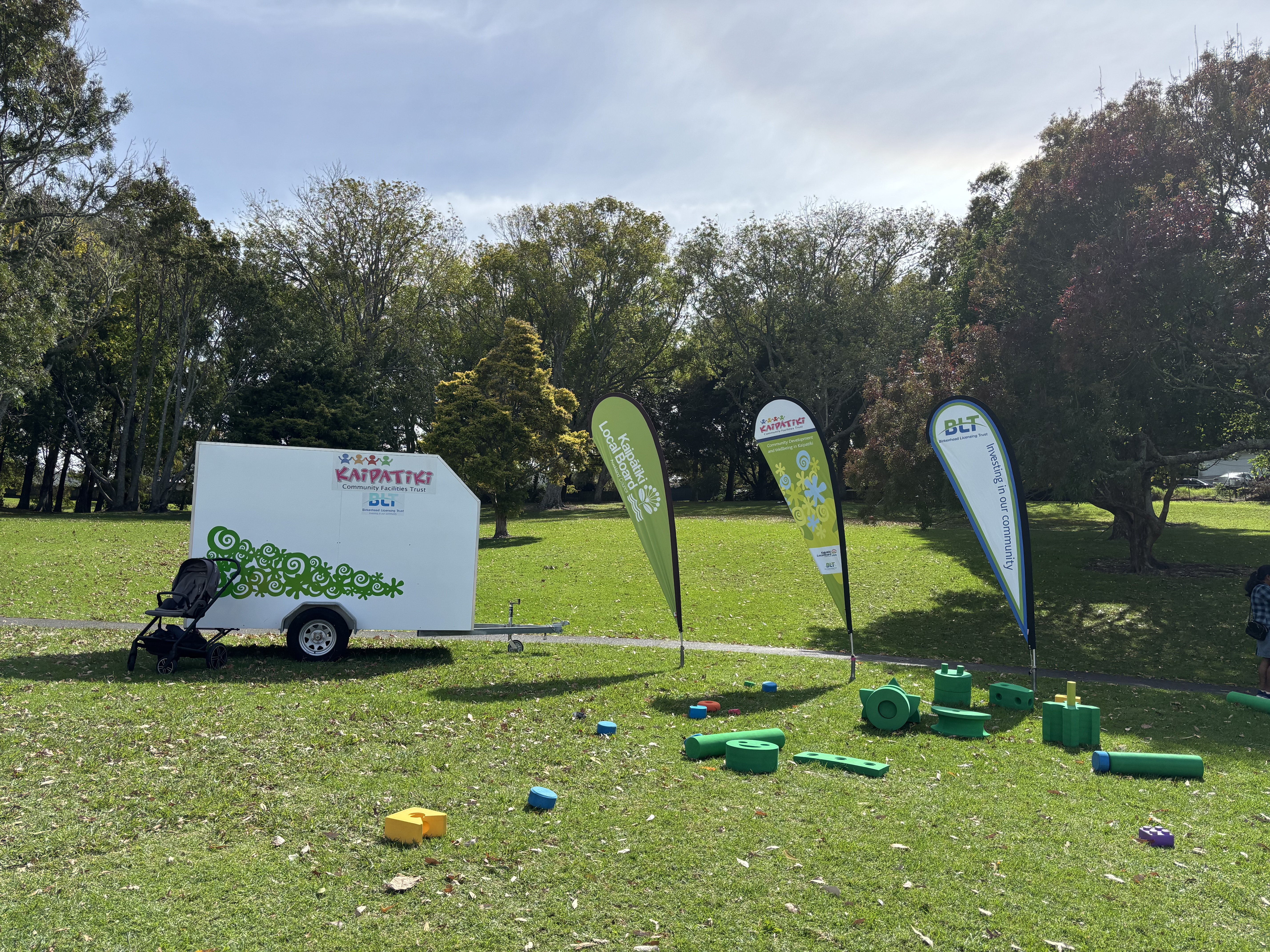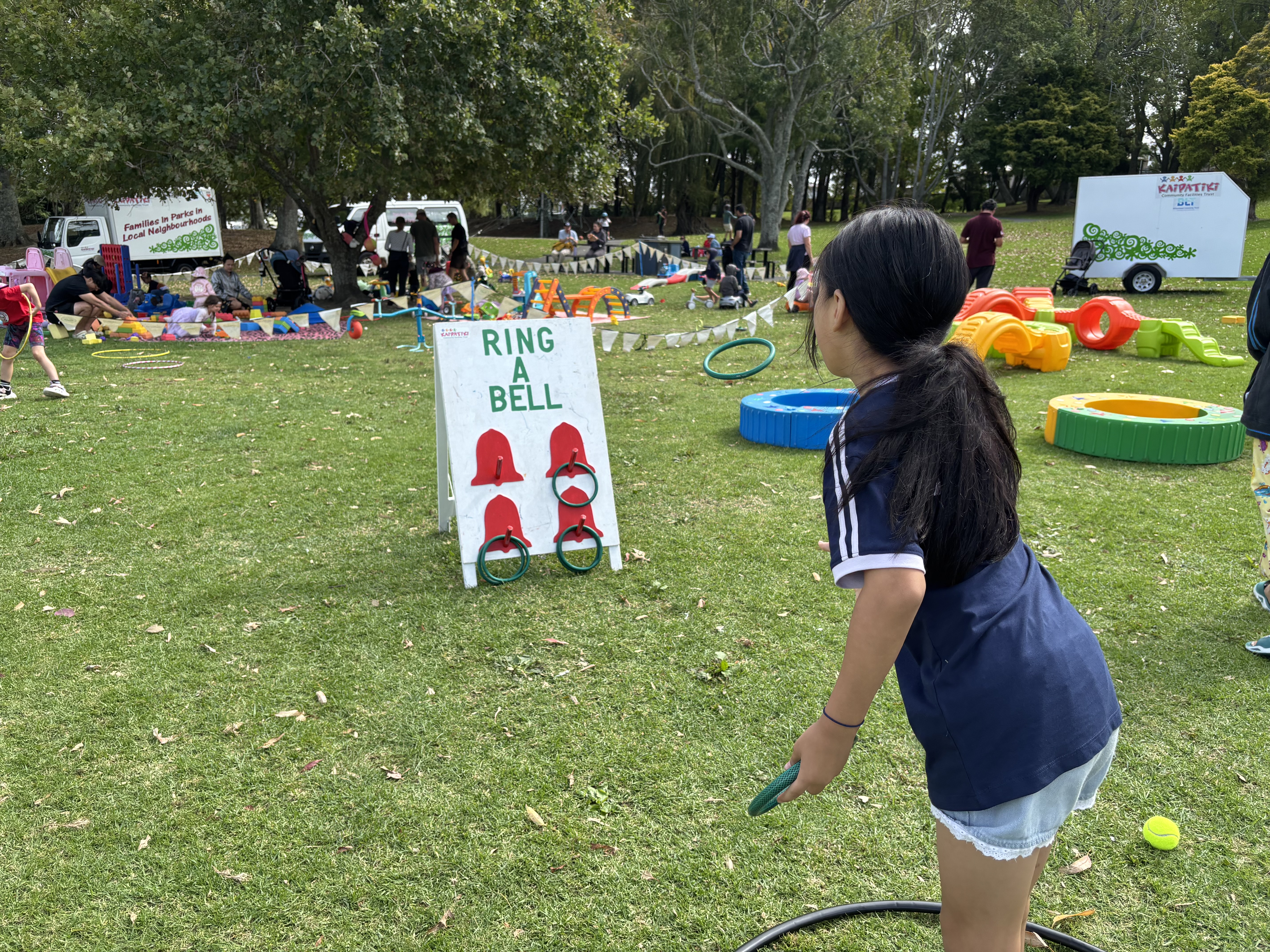 The event is called Families in Parks, and it's run by the Kaipatiki Community Facilities Trust — the same organisation behind the Summer and Winter Fun Programmes that bring free outdoor activities to parks and schools across the Kaipātiki area. The idea is straightforward: give families a reason to be outside together, to take up space on a lawn, to bump into the neighbours. No screens, no cost, no registration. I had a little chat with a staff who told me they were wrapping up the summer programme — this was one of the final events before the winter break. We'd arrived on the last day almost by accident.