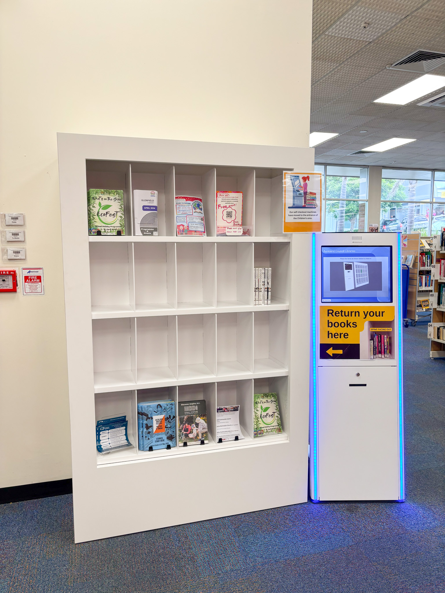 Auckland libraries have been rolling out automated returns alongside their self-checkout kiosks, and Glenfield has a large return shelf in its own corner. Anyone can borrow and return without needing to flag down a staff member.