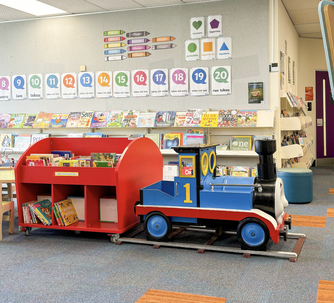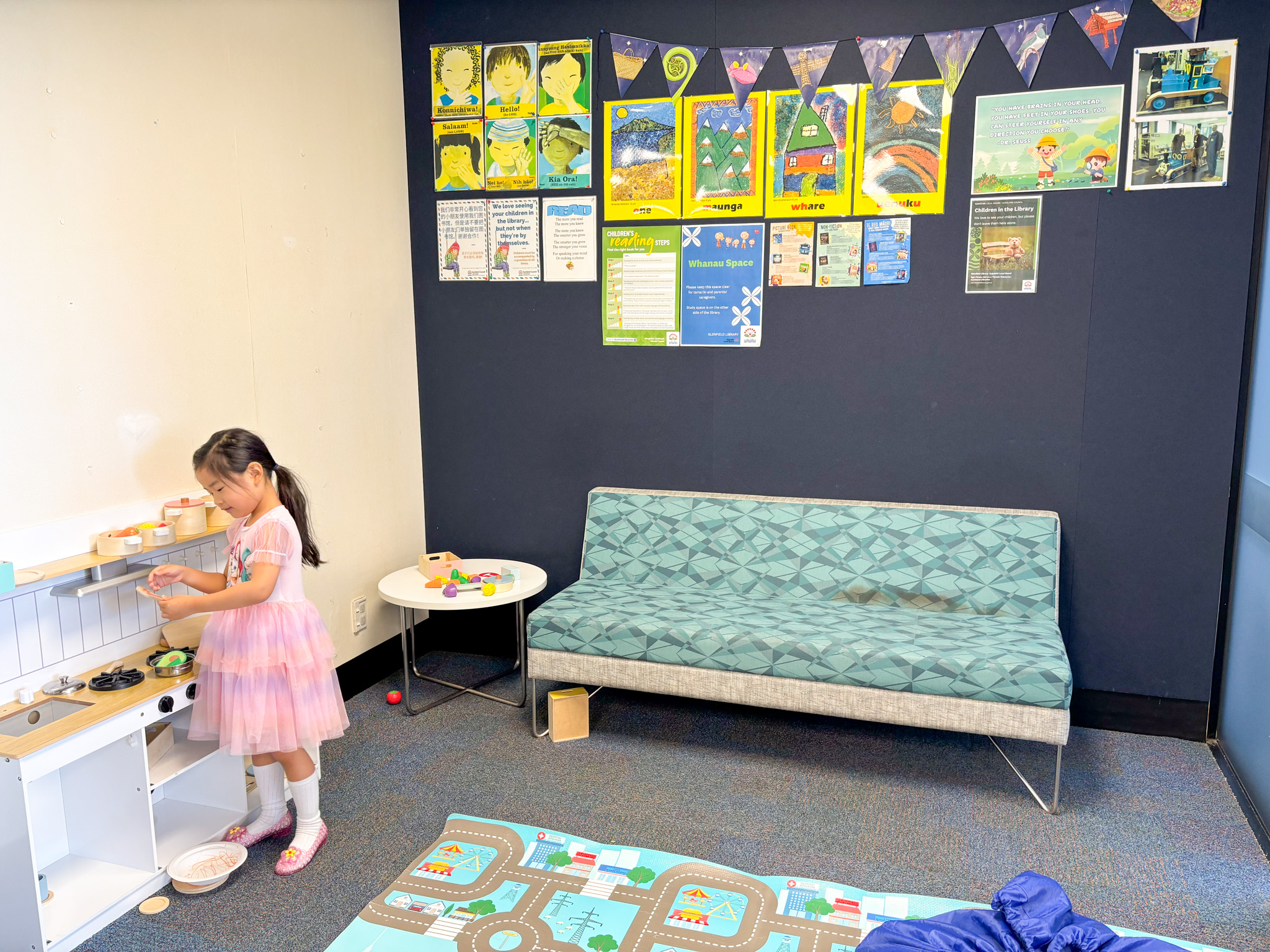 Like many Auckland libraries, Glenfield is unmistakably child-friendly. The children's section is generously sized, with a small toy corner tucked off to one side. Jin took to the library's play kitchen with more enthusiasm than she shows for the one at home, and stayed deep in cooking mode the whole time we were there. Which left me to choose her books — no hardship, with low sofas and child-height shelving running through the area. At the centre of it all sits a colourful Thomas the Tank Engine, holding picture books and quietly receiving the affection of every child who walks past.